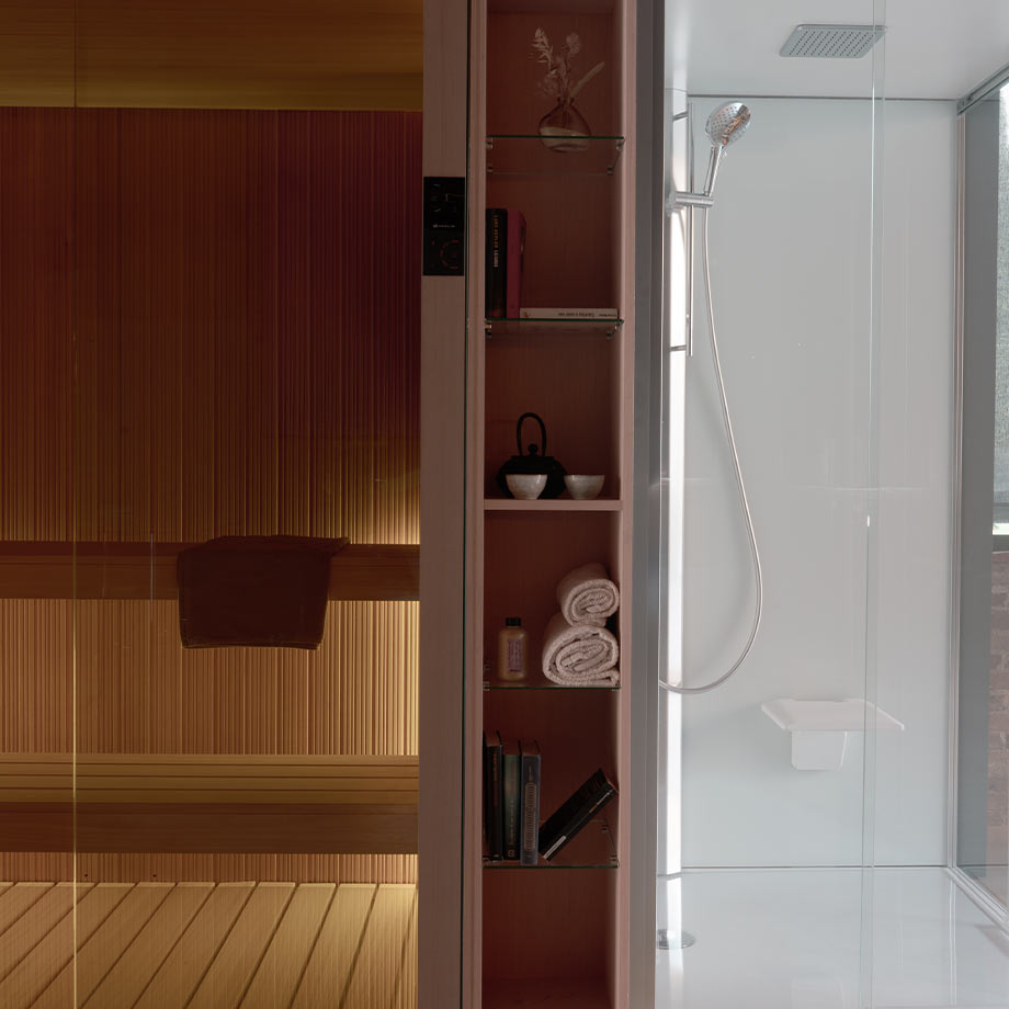 El concepto de conectar una cabina Glax de Novellini con la sauna Fun fue desarrollado para garantizar practicidad y funcionalidad. Esta conexión optimiza el espacio, haciendo que la experiencia sea aún más completa, accesible y versátil, sin renunciar al confort y la calidad.